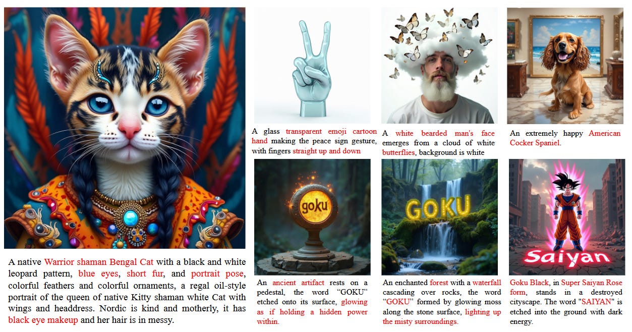 Goku has been evaluated on both text-to-image and text-to-video benchmarks, demonstrating its competitive advantages. For text-to-image generation, Goku-T2I demonstrates strong performance across multiple benchmarks, including T2I-CompBench, GenEval, and DPG-Bench, excelling in both visual quality and text-image alignment.